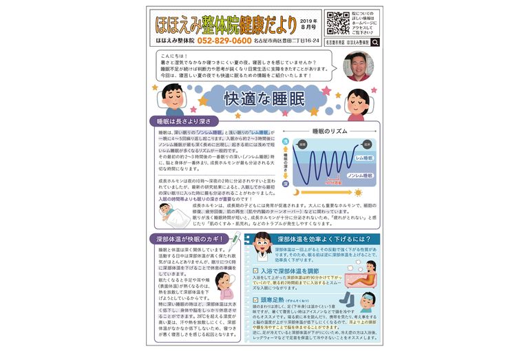 名古屋市の整体、骨盤矯正で人気の「ほほえみ整体院」の健康情報、健康だより2019年8月号「快適な睡眠」です!